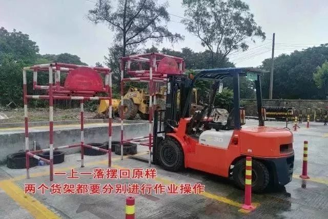 作業(yè):乙?guī)斓呢浖埽ǜ叩哪莻€(gè))入叉叉貨以后倒車(chē)直接升到頂(油缸提升的時(shí)候要加油提速,不要怠速提升),放下后稍微停一下,馬上又提升放回下層,然后倒車(chē)入丁庫(kù),入庫(kù)時(shí)只要求整車(chē)身入庫(kù),入庫(kù)后,貨叉要放到地,不然要扣分。丙庫(kù)的貨架一樣的操作,貨架放地上以后,倒車(chē)回甲庫(kù)起點(diǎn),貨叉也要入庫(kù),謹(jǐn)記貨叉要后傾并提升至離地20-40cm。