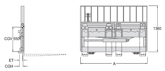 Capacity 承載能力(kg) | Catalog Order NO 型號(hào) | Mounting Class 安裝等級(jí) | Opening Range貨叉調(diào)距范圍ITO(mm) | Minimum Truck Carriage Width叉車(chē)貨叉架寬度最小值(mm) | Overall Width總寬A(mm) | Fock Pocket Width適配貨叉寬度(mm) | Weight 自重(kg) | Effective 失載距ET(mm) | Horizontal Center of Gravity 水平重心CGH(mm) |