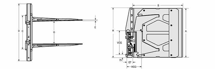 Capacity 承載能力(kg) | Catalog Order NO 型號(hào) | Mounting Class 安裝等級(jí) | Load Center載荷中心(mm) | Opening Range張臂范圍(mm) | Arm Height臂高A(mm) | Arm Length臂長(zhǎng)B(mm) | Arm Thickness臂厚E(mm) | Overall Width總寬D(mm) | Overall Height總高H(mm) | Vertcial Center Of Gravity垂直重心VCG(mm) | Hook Spread上鉤外側(cè)間距(mm) | Weight 自重(kg) | Effective 失載距ET(mm) | Horizontal Center of Gravity 水平重心CGH(mm) |