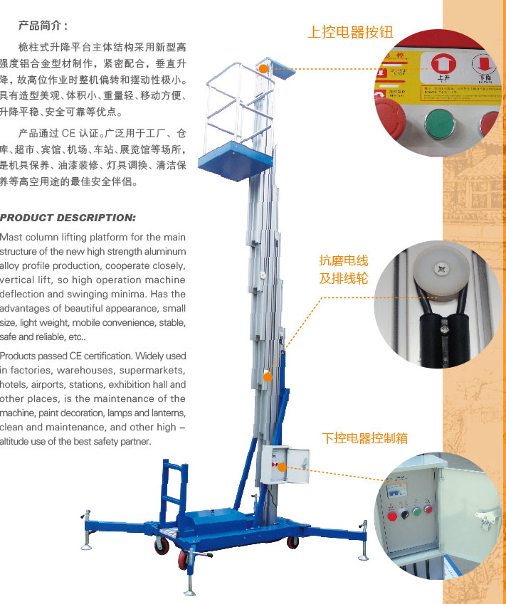 桅柱式升降平臺主體結(jié)構(gòu)采用新型高強度鋁合金型材制作,緊密配合,垂直升降,故高位作業(yè)時整機偏轉(zhuǎn)和擺性極小。具有造型美觀、體積小、重量輕、移動方便、升降平穩(wěn)、安全可靠等優(yōu)點。